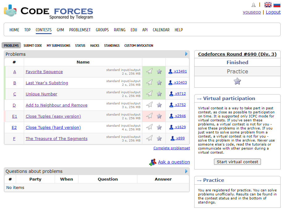 Codeforces Round #690 (Div.3) 총 일곱문제가 출제되었고, 이중 3문제 밖에 풀지 못했다.