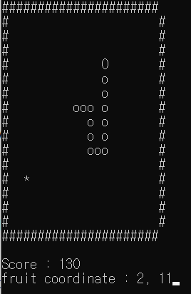 void Draw() { system("cls"); // 화면에 출력된 정보들을 지운다. for (int i = 0; i < width+2; i++) cout << "#"; cout << "\n"; for (int i = 0; i < height; i++) { for (int j = 0; j < width+2; j++) { if (j == 0) cout << "#"; if (j == width + 1) cout << "#"; if (i == y && j == x) cout << "O"; // 뱀의 머리 else if (i == fruitY && j == fruitX) cout << "*"; else { bool print = false; for (int k = 0; k < nTail; k++) { if (tailX[k] == j && tailY[k] == i) { cout << "o"; // 뱀의 꼬리 print = true; } } if (!print) cout << " "; } } cout << "\n"; } for (int i = 0; i < width + 2; i++) cout << "#"; cout << "\n"; cout << "\n"; cout << "Score : " << score << "\n"; cout << "fruit coordinate : " << fruitX << ", " << fruitY; }Input