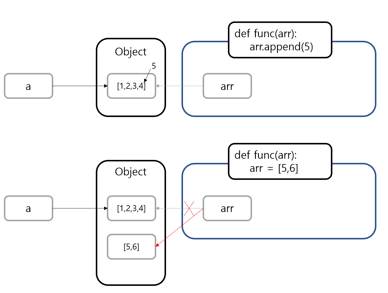 여기서 arr.append(5)를 하게 되면, 리스트는 mutable하기 때문에 5가 추가된 새로운 객체가 생성되는 것이 아니라, 기존의 동일한 id를 가지는 리스트에 5가 추가된다.
