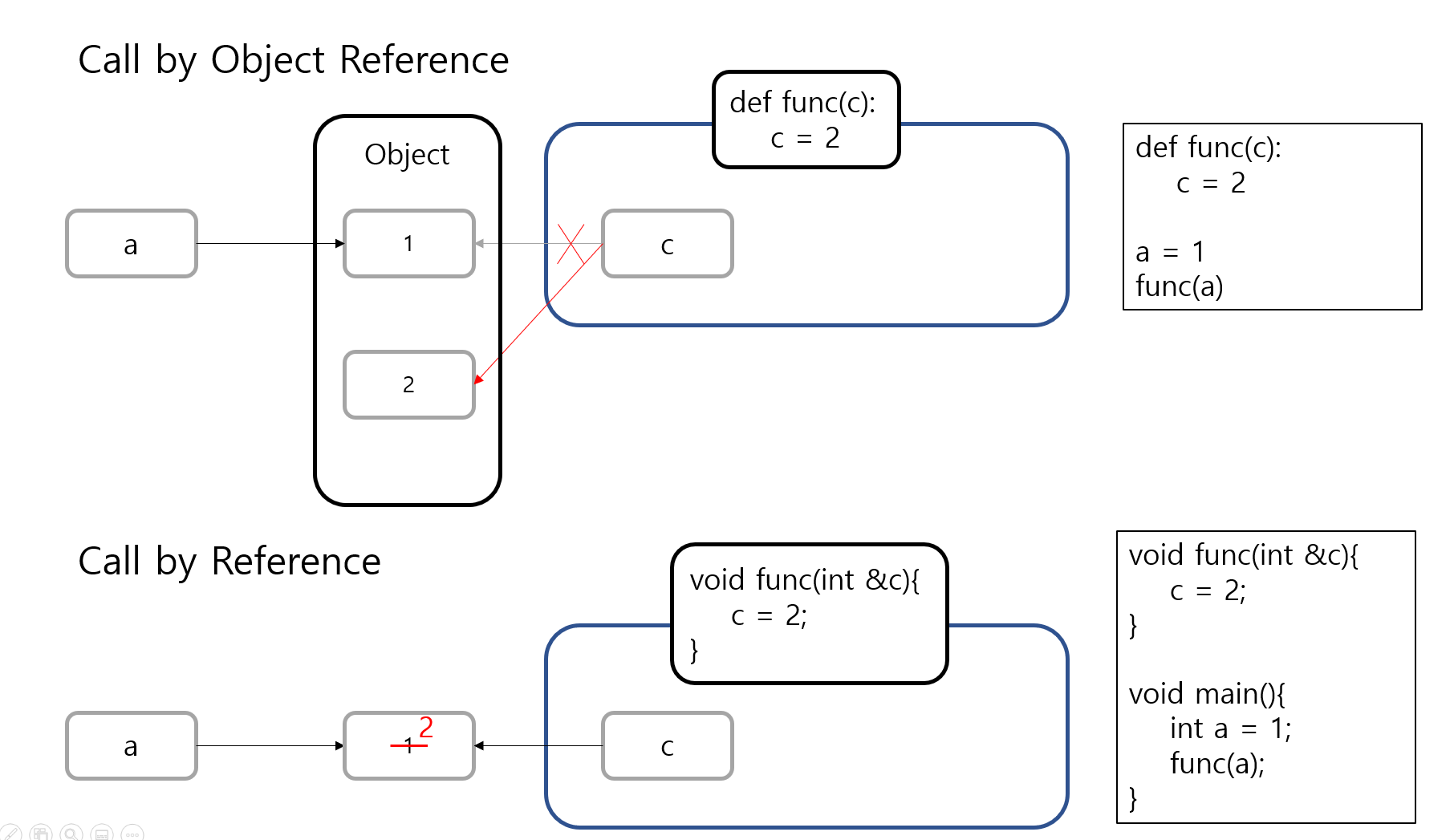 이렇게 함수에 a라는 변수를 전달하면, c라는 변수도 a가 가리키는 객체인 1을 가리키게 된다.