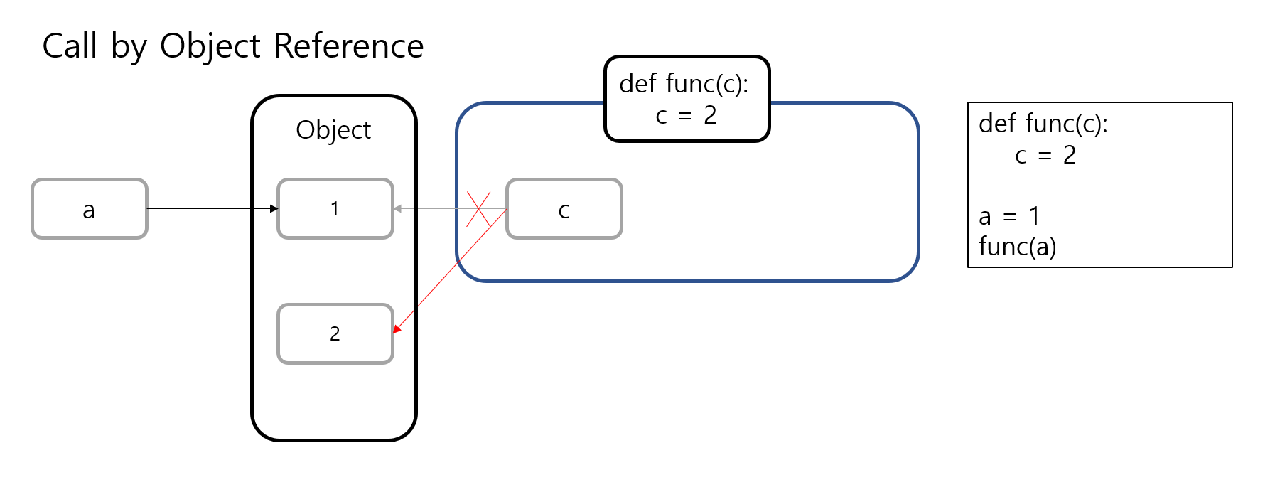 함수 내에서 c의 값을 2로 변경하게 되면, c라는 변수의 값이 1에서 2로 바뀌는 것이 아니라, 2라는 객체가 생성되고 1에 붙어있던 local variable 'c'가 2에 붙게 되는 것이다.