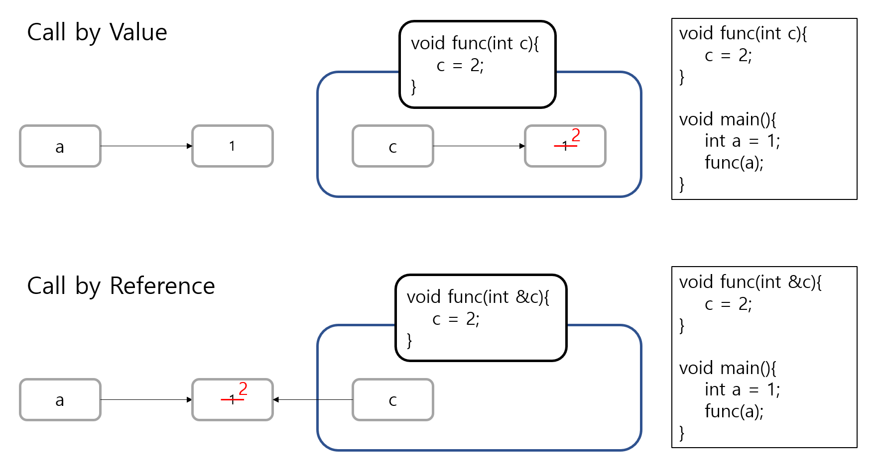 함수에 인수를 전달하는 방식이다. Java 혹은 C언어의 포인터로 함수의 인자에 전달하는 방식이 이와 같은 방식이다.