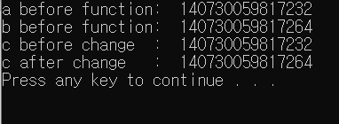 def func(c): print('c before change : ',id(c)) c = 2 print('c after change : ',id(c)) a = 1 print('a before function: ',id(a)) b = 2 print('b before function: ',id(b)) func(a)