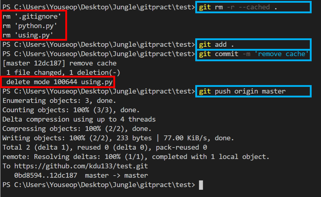 .gitignore가 정상적으로 작동 cache가 삭제되고 using.py가 정상적으로 ignore 되었음을 확인할 수 있다!