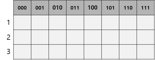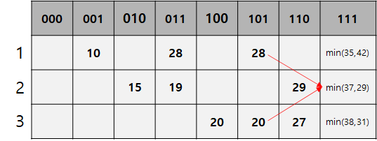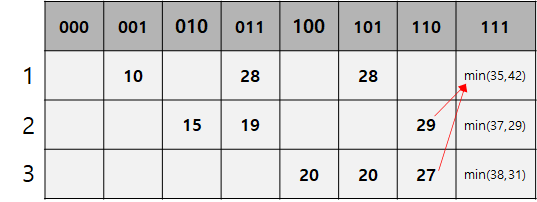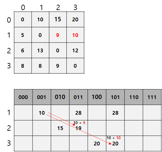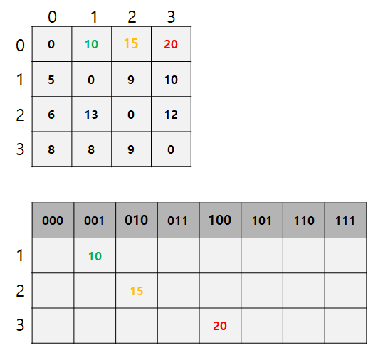 - 110으로 표시된 칸의 경우 2번 도시와 3번 도시를 방문했다는 의미이다. 이진법으로 표기되어 있음으로, 실제 인덱스는 6이다.