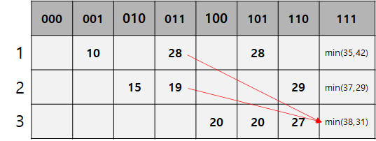 - dp[0][1 (= 001)] = 10
