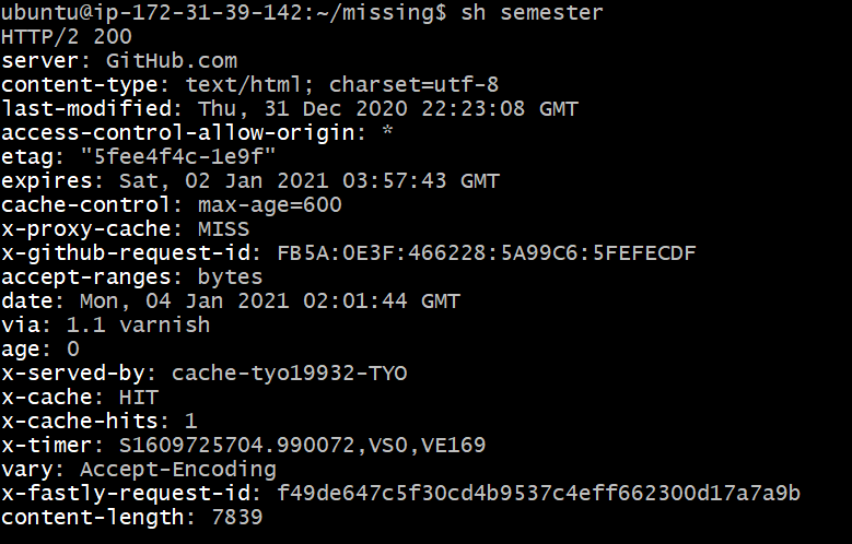 curl --head --silent https://missing.csail.mit.edu위의 명령어가 실행되어 아래와 같이 출력된 것이다.