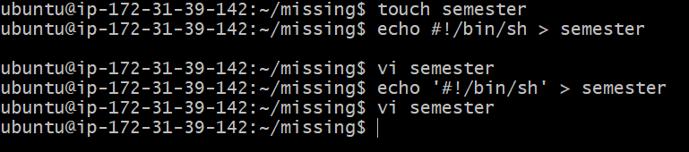 - touch를 이용해서 semester라는 파일을 missing 안에 만들어 보세요.