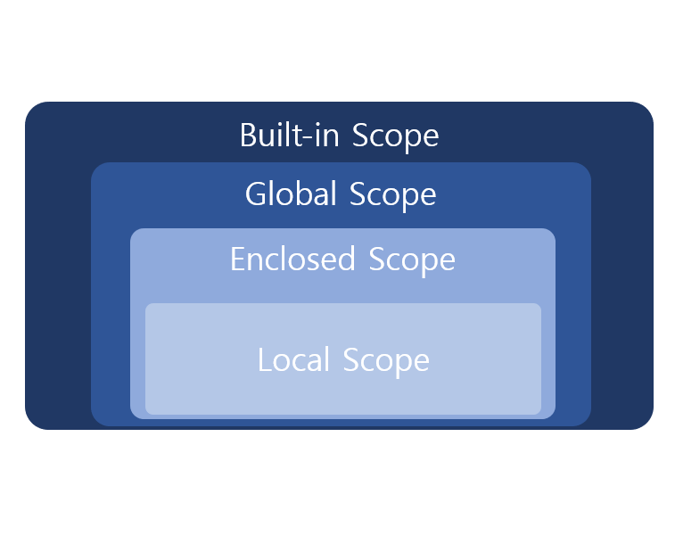 Local Scope, Enclosed Scope, Global Scope 그리고 Built-in Scope 이렇게 네가지 종류의 Scope가 있다.