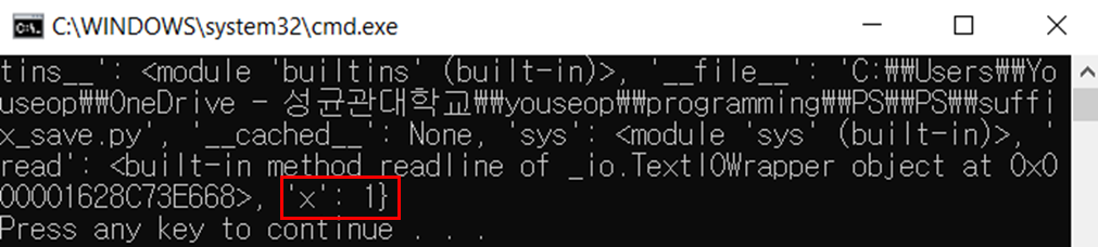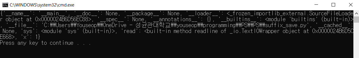 x = 1 print(locals())함수가 실행되고 있지 않기 때문에 globals()와 같은 출력을 볼 수 있다.