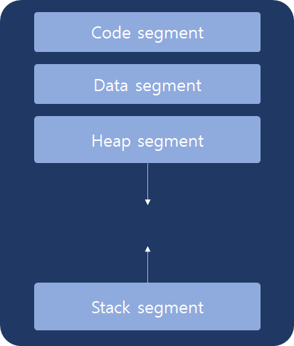 위의 그림과 같이 메모리의 code segment, data segment, heap segment. stack segment에 데이터가 저장된다. 함수를 호출할 때 지역변수는 stack segment에 저장되게 된다.