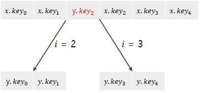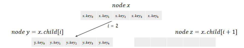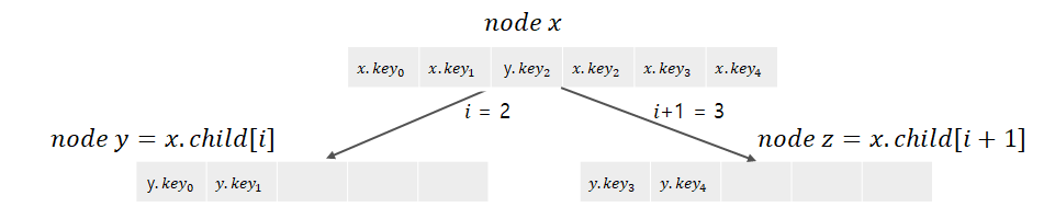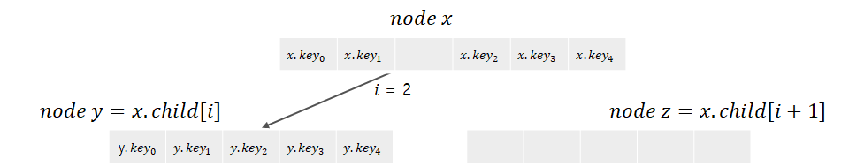 y를 분할하면, 키 1개가 x로 올라가게 된다. 이 키가 들어갈 자리를 확보하기 위해 x의 키를 오른쪽으로 한 칸씩 오른쪽으로 밀어준다. 그림에서는 나타내지 않았지만, x에는 자식들을 가리키는 포인터들도 존재한다. x에서 z를 가리킬 포인터를 y 오른쪽에 삽입해 주어야 함으로, 이 공간을 확보하기 위해 x의 자식들도 한 칸씩 오른쪽으로 밀어준다.