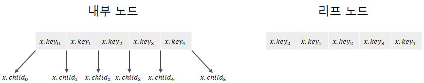 내부 노드의 경우 5개의 key를 가지고, key의 개수보다 1이 많은 6개의 자식을 '반드시' 가진다.