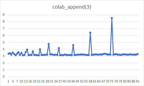 colab의 log를 캡쳐해온 것인데, large alloc warning이 발생한다. 솟아오른 지점에서 배열을 realloc하는구나 라고 추측된다. 캐시의 영향도 존재할 듯 하다. (현재는 추측이며, 정확한 원인을 알아가는 과정이다. 이 과정을 포스팅할 계획이다.)